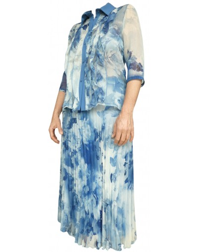 Art.24005, camicia donna manica 3/4, taglie regolari, in chiffon e crepè, con rouches davanti, fantasia azzurra. Vestibilità regolare, chiusura con asole e sei bottoni. Capo che si adatta a svariate situazioni che vanno dalla cerimonia al lavoro al tempo libero. Abbinabile con gonna art.24009.
