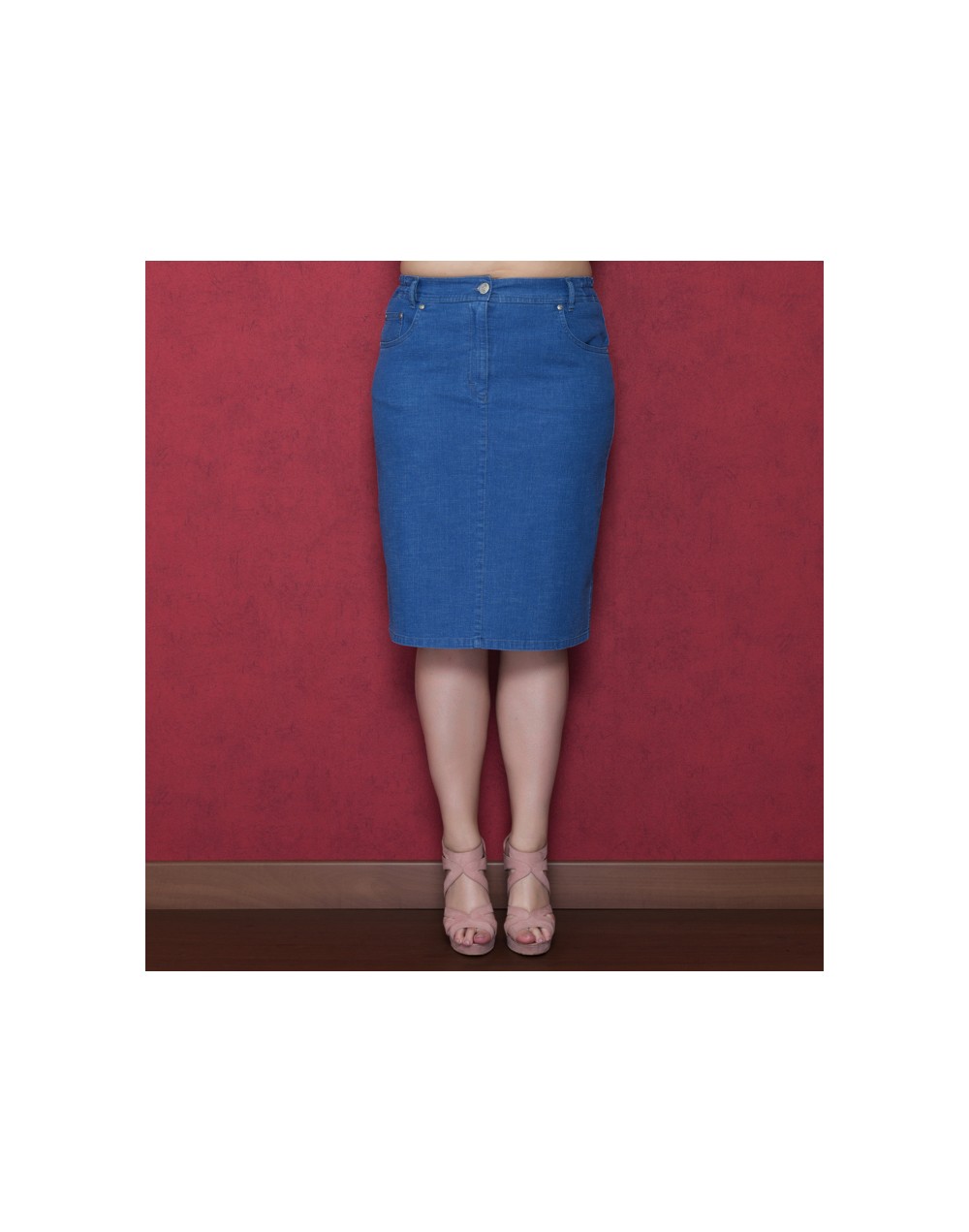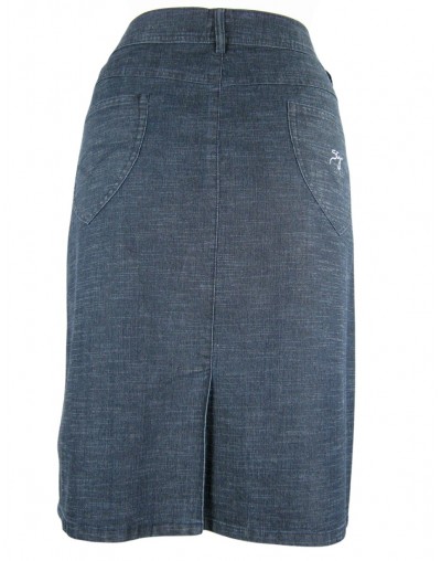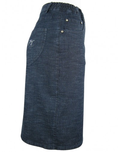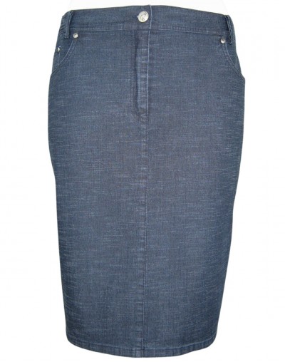 NOSTRA PRODUZIONE. Art.8392-4800+, gonna 5 tasche, curvy fit, in denim elasticizzato "tela ragno", lavato blu dark ed azzurro stone wash, due tasche anteriori con sottostante taschino sul lato destro, due tasche posteriori, logo in strass sulla tasca posteriore. Vestibilità regolare, dai volumi proporzionati ne troppo aderenti ne troppo ampi, altezza vita regolare. Per una donna che ama vestire classico e non vuol rinunciare al confort. Capo soffice, fresco particolarmente confortevole e plurifunzionale, si adatta infatti a svariate occasioni che vanno dalle situazioni domestiche, al lavoro, al tempo libero.
