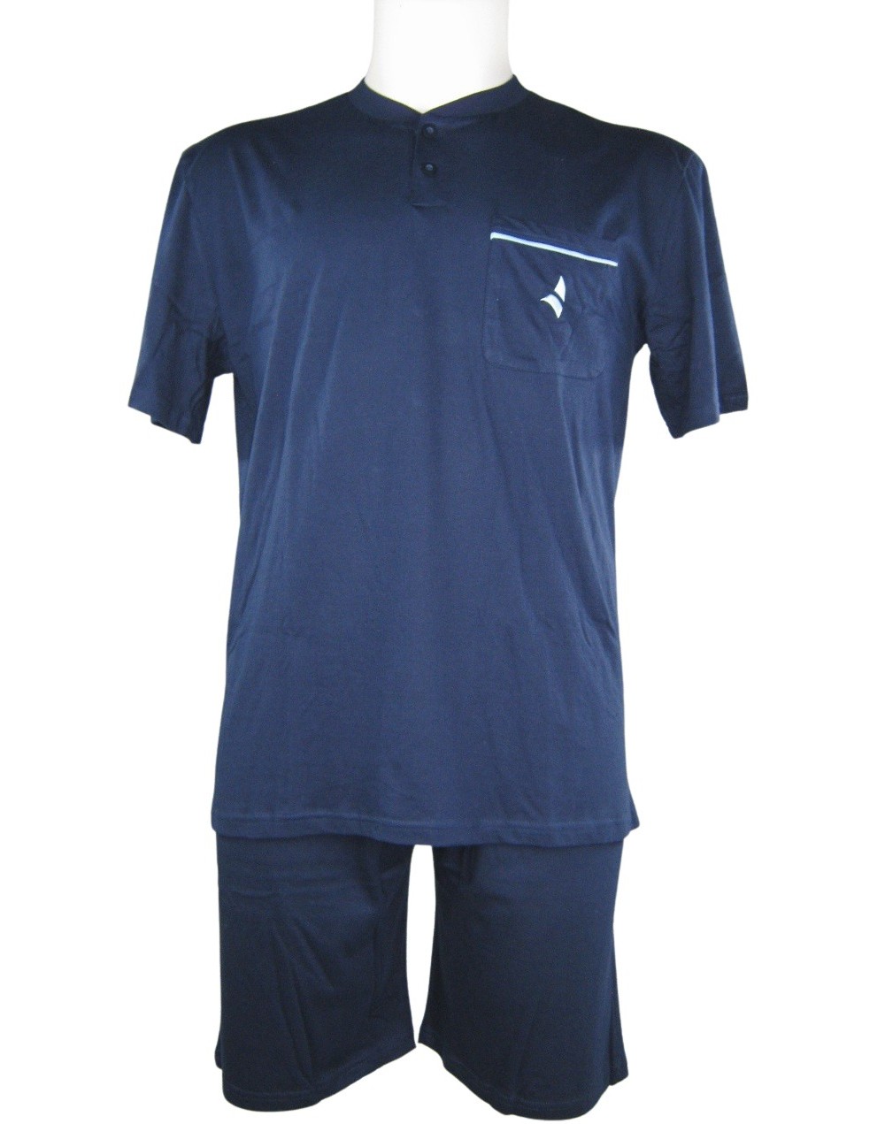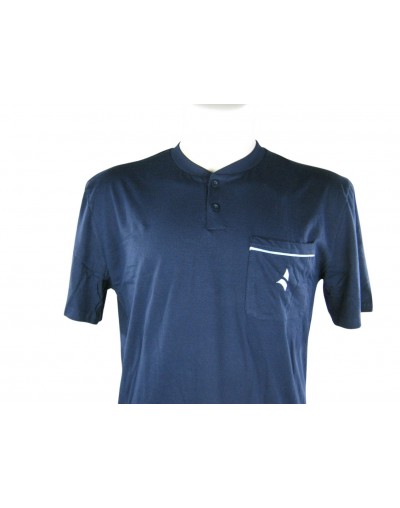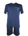 Navigare art.14281b, pigiama uomo mezza manica serafino, in jersey di cotone, taglie regolari, colore blu. Casacca: collo serafino due bottoni , taschino lato sinistro con ricamo logo, pantalone: corto con elastico in vita, taschino posteriore. Capo morbido e particolarmente confortevole.