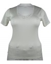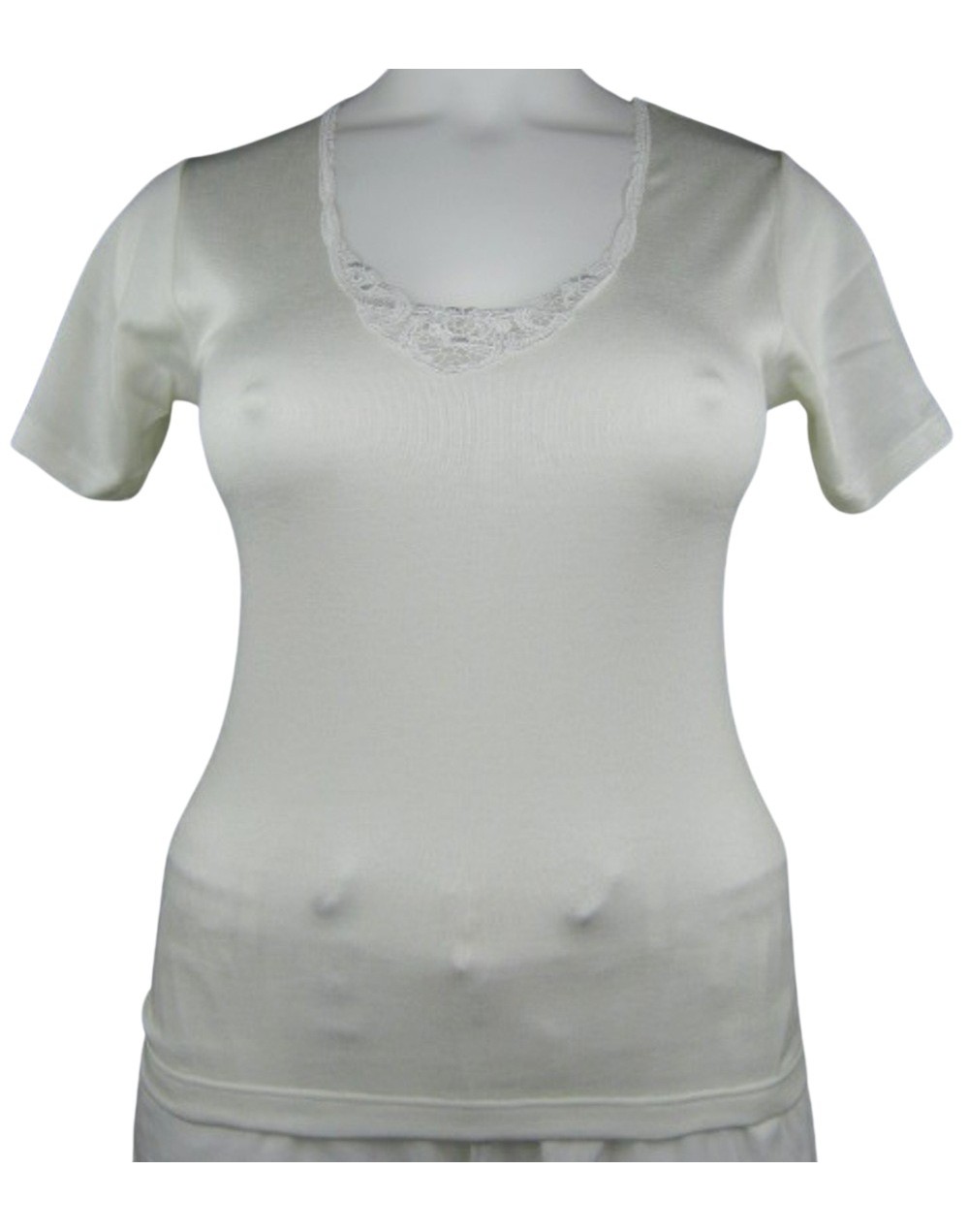 Art.897, maglia donna taglie regolari, mezza manica, in confortevole costina dual lana e cotone, con delicato inserto macramè, bordino in raso, colore bianco lana. Capo soffice e particolarmente confortevole, realizzato con materie prime accuratamente selezionate. La ricerca della perfetta vestibilità, la naturale traspirazione del tessuto e l'accuratezza della manifattura, a contatto con la pelle garantiscono il massimo confort.