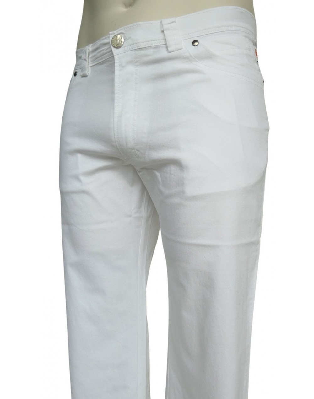 NOSTRA PRODUZIONE. Art.8037-4829, pantalone 5 tasche uomo, taglie regolari, in cotone pettinato leggero elasticizzato rigorosamente italiano, colore bianco, due tasche anteriori con sottostante taschino sul lato sinistro, due tasche posteriori "effetto sovrapposto". Vestibilità regolare, dai volumi proporzionati, ne troppo aderenti ne troppo ampi, altezza vita regolare, gamba regolare. Capo cool, prodotto per un uomo che ama vestire giovane ma non vuol rinunciare al confort. Morbido, fresco, particolarmente confortevole e plurifunzionale, si adatta infatti a svariate occasioni che vanno dalle situazioni domestiche, al lavoro, al tempo libero.