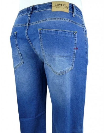Coveri Moving art.cov906, pantalone 5 tasche uomo, taglie forti, in denim elasticizzato, lavato stone wash sabbiato, colore azzurro, due tasche anteriori con sottostante taschino sul lato destro, due tasche posteriori. Vestibilità slim, dai volumi ridotti, abbastanza aderente, altezza vita regolare, gamba asciutta. Capo cool, prodotto per un uomo che ama vestire giovane ma non vuol rinunciare al confort. Morbido, particolarmente confortevole e plurifunzionale, si adatta infatti a svariate occasioni che vanno dalle situazioni domestiche, al lavoro, al tempo libero.