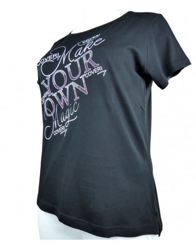 Coveri Moving art.dt3034, t-shirt donna girocollo, mezza manica, taglie regolari, in cotone, colore nero, con strass e stampa, vestibilità regolare, con spacchetti al fondo. Capo cool, senza rinunciare al confort, fresco, morbido, versatile, adatto a svariate situazioni che vanno dal relax in casa allo sport al lavoro al tempo libero.